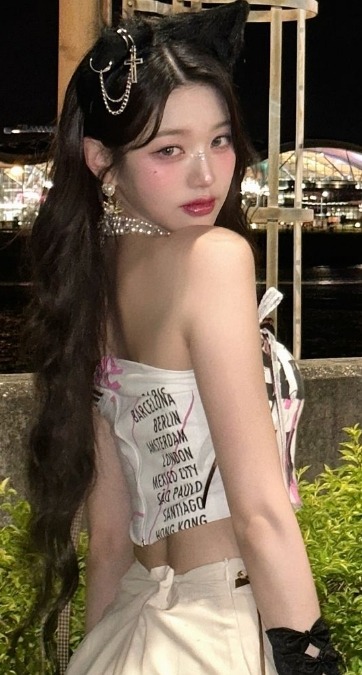 And so, Wonyoung turns and sinks to her knees, fingertips burying into the soft red carpet. Her spine curves beautifully. Such an alluring silhouette as she gets on all fours. Her black hair drifts across the back of her shoulders as she begins moving. Her hips demand attention with each little jut and the way the fake tail brushes over her thighs.